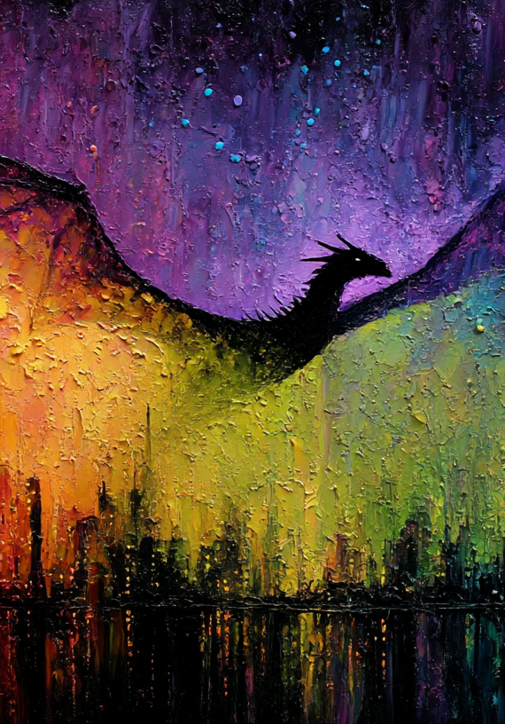 Dark Fantasy, Rainbow Dragon in flight over a city 02–sref 2091021549 334526333464294f44-c4e7-4854-9ad3-04398fd95671